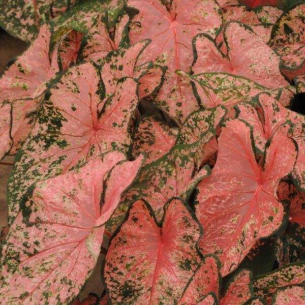 Caladium 'Pink Beauty' is a large, heart-shaped leaves with a base of soft, bright pink, accented by dark scarlet-red veins and framed by a distinct, deep green border. A vibrant, high-contrast variety.