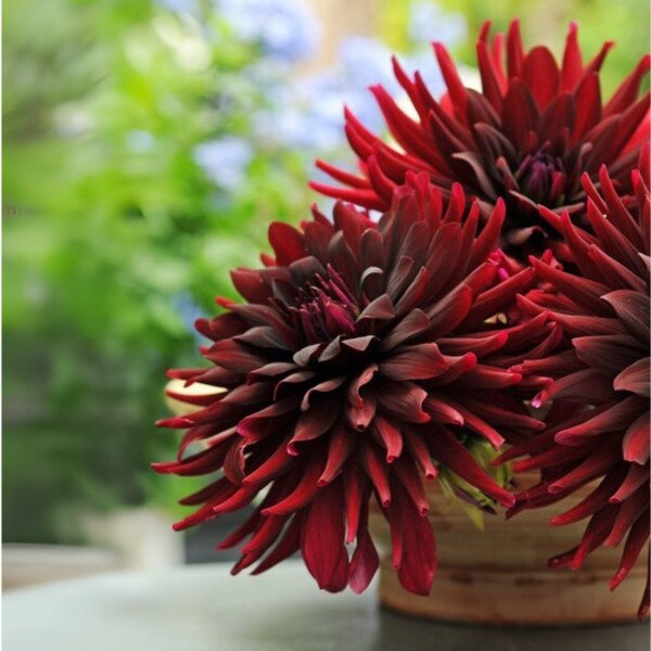 A dramatic and elegant semi-cactus variety with deep wine-red, almost black-centered blooms. The pointed, slightly twisted petals give a spiky, sophisticated look. Produces richly colored blooms on sturdy, long stems, ideal for high-end floral arrangements. Excellent cut flower. Grows tall (approx. 3.6-4.5 ft). RHS Award of Garden Merit winner.