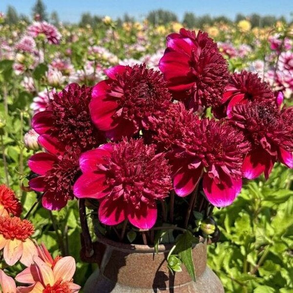 A dramatic jewel-toned variety. Deep cranberry-purple outer petals contrast beautifully with a textured, fuzzy pincushion center in deep wine red. Blooms are a smaller, useful size at about 3 inches, held on strong stems up to 4 feet tall.